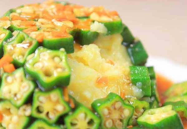 5.再取一个盘子盖住,把土豆泥和秋葵倒扣在盘子里,一个漂亮的秋葵绣球就做好了。喜欢原汁原味的就可以直接食用了。