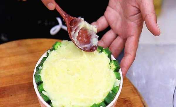 3.准备一个小碗,在里面刷一层植物油。把秋葵贴着碗边摆放,这个时候土豆也蒸熟了,用筷子轻轻一戳就碎,我们把土豆取出来,用勺子压成土豆泥。