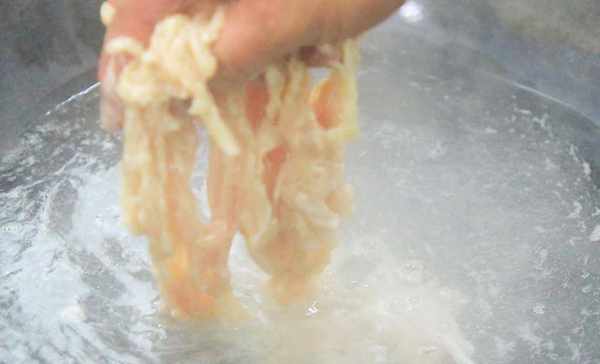 2.起锅烧水,水开以后倒入鸡丝,快速在热水中焯烫至定型后,捞出控油备用。