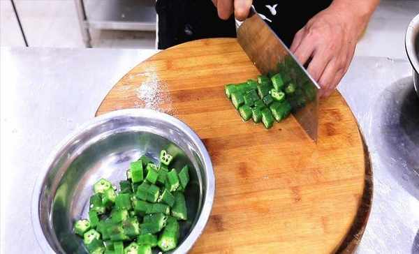 2.锅内烧水,加入一勺食盐入底味,把秋葵放入锅中煮2分钟,返青以后倒出来,放凉去除硬蒂、切成圈备用。