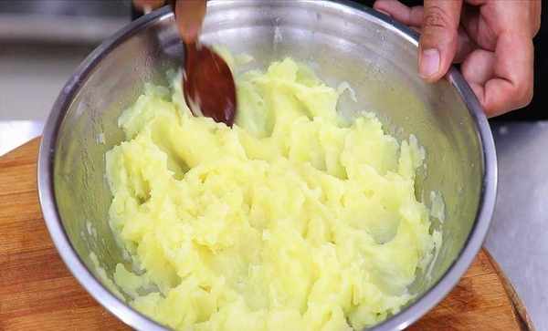 4.然后在土豆泥中加入一勺食盐入底味、搅拌均匀,把土豆泥挖入装有秋葵的小碗中,用勺子把表面压平。