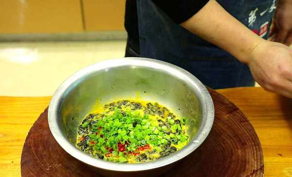 2.关火,再焙会儿。往盆里打五六个母鸡蛋,把紫菜请进去,抓碎,把它俩掺匀。这一点漂亮的红椒丁,小葱花,主要是搭配颜色用的。