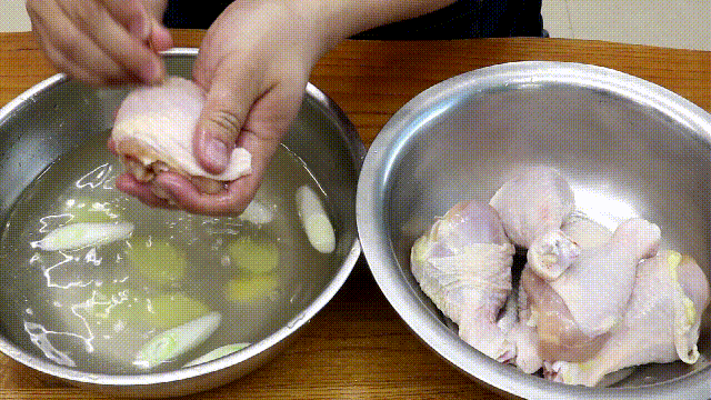 鸡腿清洗过后放入盆中,添加适量清水倒入料酒、姜片,泡1个小时,因为懒得焯水,这样做就可以去掉腥味和血水。