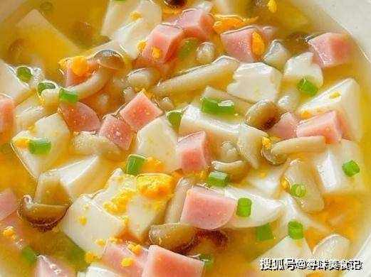 嫩豆腐,海鲜菇,火腿,蛋黄,葱花。