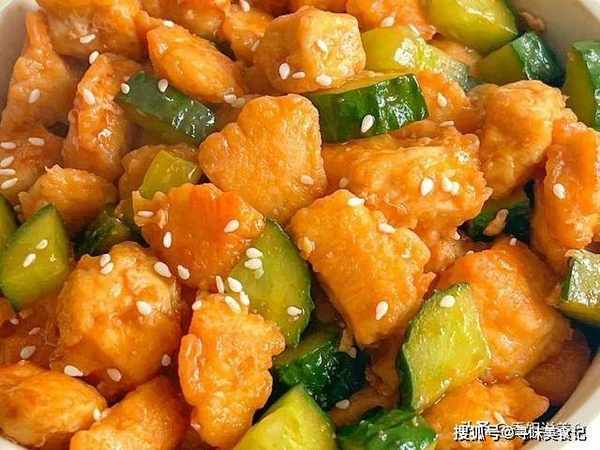 4、起锅倒入糖醋汁,煮至起泡泡,倒入鸡胸肉和黄瓜丁翻炒均匀,所有食材都裹上糖醋汁,再大火翻炒收汁即可出锅装盘。