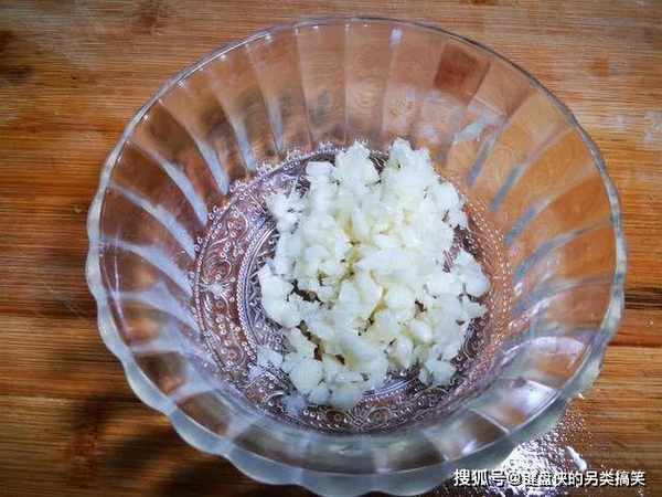 4、腌制茄子的时候,可以准备一点大蒜,去皮洗净,剁成碎末,放入小碗中备用。大蒜和茄子特别搭配,可以中和茄子的寒凉之气,从而让我们的身体更好的吸收到足够的营养物质。