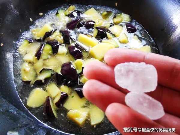 9、茄子绵软之后,放入土豆块,开始放调味料,半勺生抽,一勺耗油,两块冰糖,适量食盐,再倒入一小碗清水。