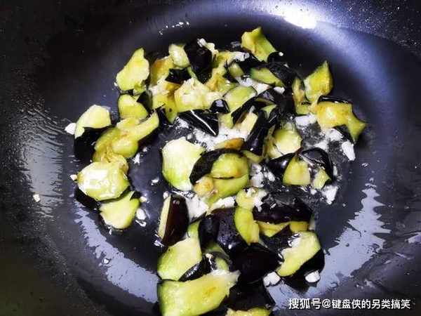 8、接着放入攥干水分的茄子翻炒,你会发现即使是倒了很少量的食用油,茄子依然不怎么吸油,这就是用盐腌制的关键所在了。