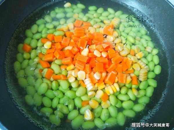 3、等到锅内水沸腾,下入毛豆、胡萝卜、玉米粒,放半勺食盐,焯水三分钟后捞出,沥干多余的水分,毛豆不容易熟,必须提前焯水。