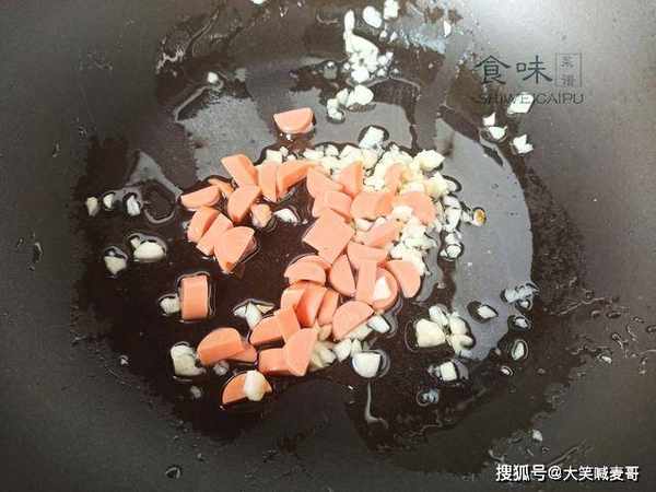 4、起锅烧油,放入蒜末,煸炒出香味,加入火腿肠,继续翻炒一会儿。