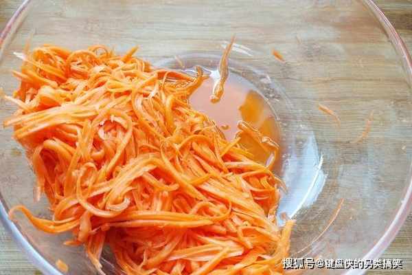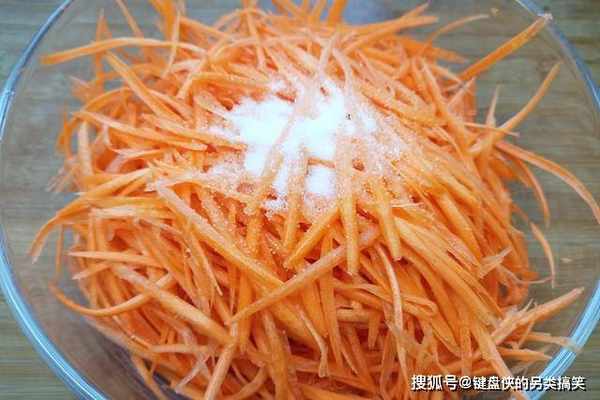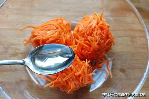 2、胡萝卜去头切尾,擦成细丝,一定要保持萝卜丝粗细均匀,越长越好,这样能更美观,剩最后一点擦不干净,可以用刀切,加入半勺食盐,杀一下些水分。
