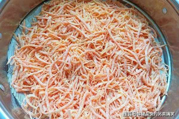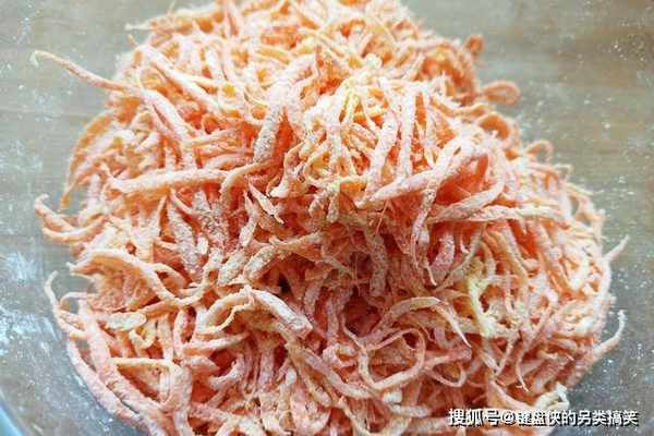 6、如图所示,这是萝卜丝半成品的样子,用的是玉米淀粉,此时的萝卜丝,已经变得根根分明,没有粘连在一起就可以。
