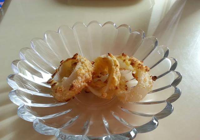 刚烤好的奶香洋葱圈外酥内软,纵使没有外面做得那么美,滋味还是挺不赖的啦!重点是用烘烤的,少了油炸的负担,宝贝可以吃得更健康哦!把拔、马麻不介意的话,当然可以让宝贝当作手指食物,练习抓握啰!