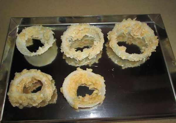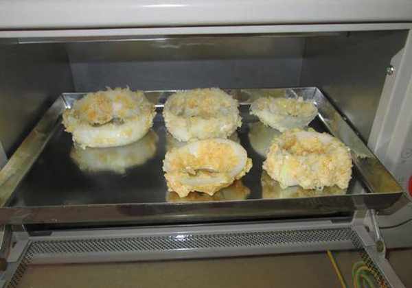 将洋葱圈半成品摆放至已经涂油的烤盘上,放入小烤箱中,烤约10分钟左右,就完成啰!每台烤箱温度不太一样,请自行判断,烤上色就ok啰!