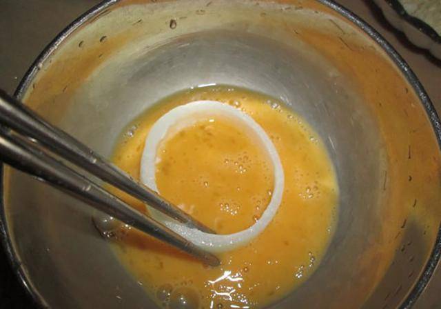 接着将洋葱圈泡一下过滤水,去除辛辣味,大约泡五分钟即可捞起。