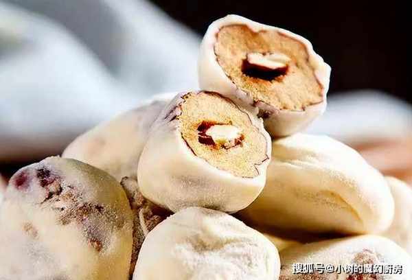 首先它看上去是一个平平无奇的奶白色椭圆体,散发着奶香味,但咬开就能看到三层不同的营养食材:棉花糖融制成的奶壳包裹着去核的灰枣,里面还塞着一整颗巴旦木仁,一口咬下三重口感,脆香美味,新奇又特别。