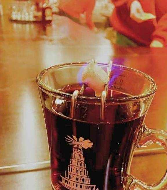 这种不是每个卖Glühwein的摊位都有的,有时候一整個市集可能只有一两家有,火钳酒是用Glühwein做基底,然后裝在形状特殊的杯子裡,马克杯上会放颗方糖,店家倒下朗姆酒后将方糖点火,使其焦糖熔化,流入下面的紅酒,喝起来酒味會比较重(酒精浓度也比Glühwein高),一边喝一边在慢慢把剩下的朗姆酒倒完,让方糖燃烧殆尽,好喝又好玩。火钳酒还有个同名电影感兴趣的可以去搜搜看看。