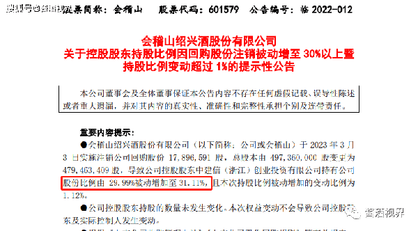 近日,会稽山发布《关于控股股东持股比例因回购股份注销被动增至30%以上暨持股比例变动超过1%的提示性公告》。公告称,公司于2023年3月3日实施注销公司回购股份17,896,591股,总股本由497,360,000股变更为479,463,409股,导致公司控股股东中建信(浙江)创业投资有限公司持有公司股份比例由29.99%被动增加至31.11%,且此次持股比例被动增加的变动比例为1.12%。本次权益变动不会导致公司控股股东及实际控制人发生变动。