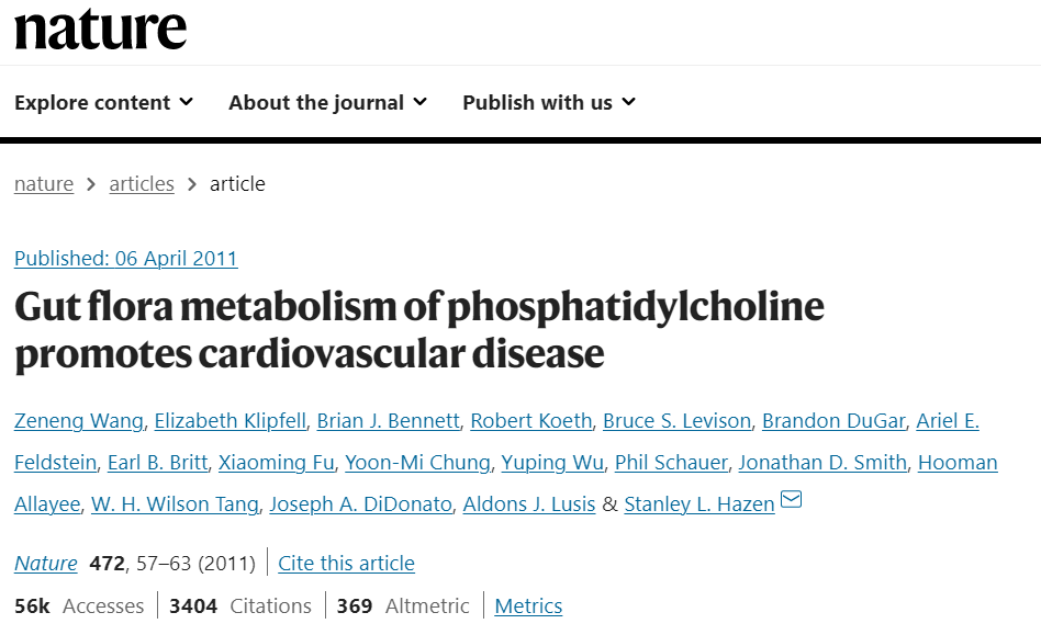早在2011年,Stanley Hazen在自然杂志发表了一篇有关磷脂酰胆碱(又叫卵磷脂,常见于日常食用的大豆油中)的文章。文章同样指出卵磷脂与动脉粥样硬化风险有相关性。