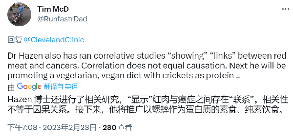 有美国网友在近期的赤藓糖醇报道下指出“相关性不等于因果关系,他只是在推广纯素饮食”。
