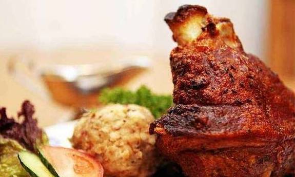 除了猪油,肘子也是他们爱吃的美食,炖肘子的味道比较清淡,更加软糯酥烂,烤肘子的口味则更加丰富,再配上他们的啤酒、酸菜,其实真的非常爽呢!