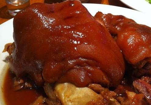 东北大肘子!选皮薄、毛孔细小的新鲜肘子,剔去骨头,修整成圆桃形状。肘子皮朝上,放入五香料卤锅加热,煮至五成熟捞出。炸好肘子捞出,放一碗内,加葱、姜,用卤汤对些水,浇入碗中,上屉蒸烂。那味道别提多么的好吃了!