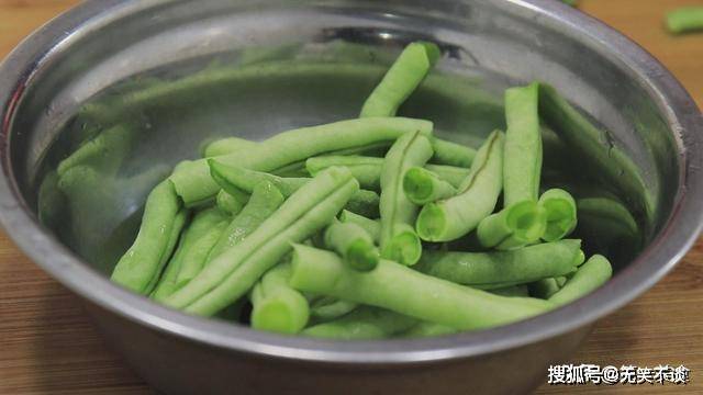 四季豆一把,摘去两端的老筋,洗净后掰成4厘米左右的长段,放在小盆中。