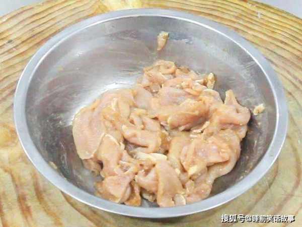 一块猪瘦肉切成薄片,加入食盐、老抽、料酒搅拌均匀后,加入植物油搅拌腌制5分钟;几朵平菇撕成宽条;一个青椒去籽切成菱形片;半个红椒切片;葱白切成粒;生姜切成片;5粒大蒜切成片;准备一小把红干椒。
