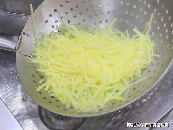 锅中水烧开以后放入土豆丝焯烫30秒钟,土豆丝变色以后倒出过凉控水备用。
