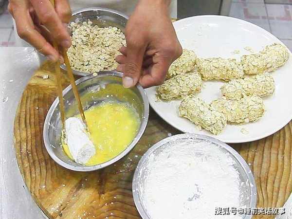 四根香蕉切成四厘米左右的段;准备三个小盆:分别是玉米淀粉、鸡蛋液、玉米片;香蕉段先裹上玉米淀粉,再裹上蛋液,最后均匀地裹上玉米片。