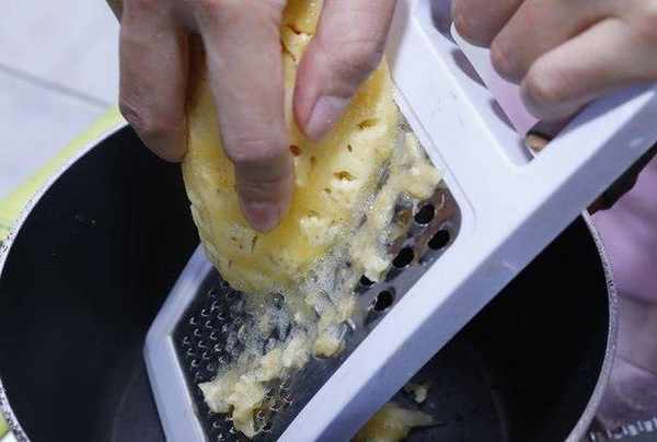 将凤梨去皮、去心,然后利用刨丝刀把凤梨果肉刨成小碎块。