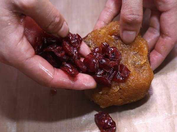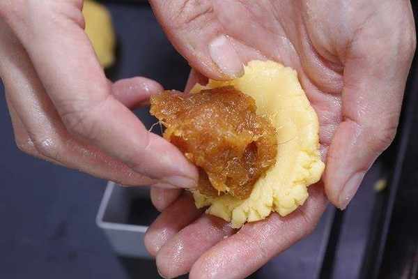 用1比1的比例把凤梨馅包入面团。