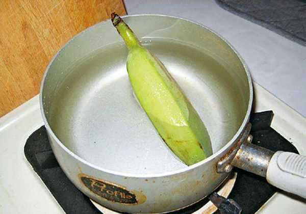 Tips:因为要经过水煮程序,所以建议香蕉要选择比较不熟的,也就是外表颜色较青绿色的,口感才不会过于软烂。