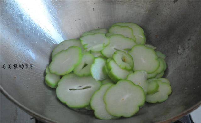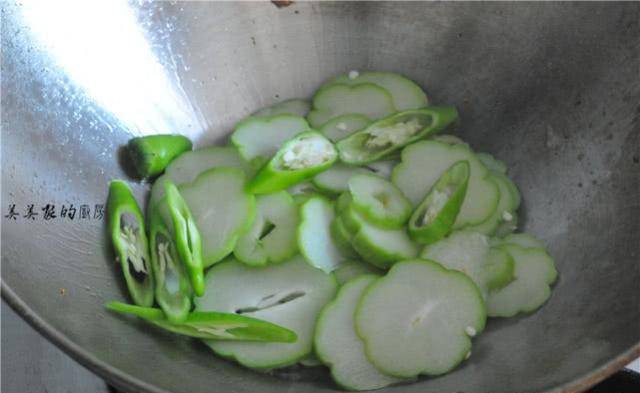 锅里重新放油,烧热后将佛手瓜片倒进去,翻炒一分钟,至佛手瓜片微微变软。