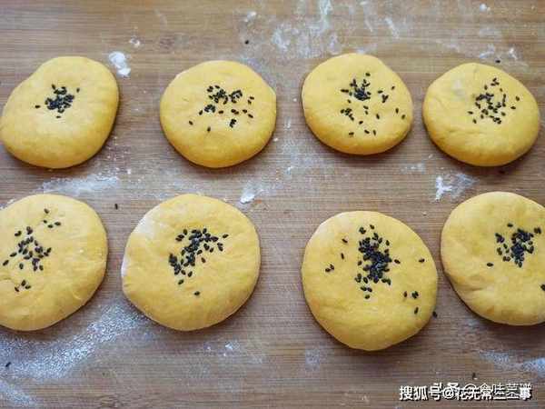 8、放在案板上,每一个都撒上黑芝麻,轻轻按压结实,盖上一层保鲜膜,发酵至2倍大,约50分钟左右。