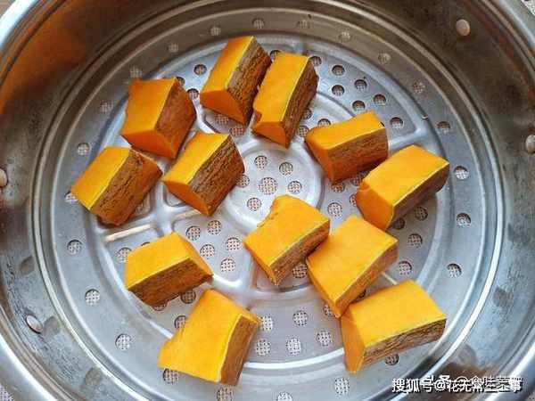 2、先处理南瓜,洗净切成小块,对南瓜皮介意的可去掉,上锅蒸15分钟,用筷子轻松扎透表示即可。