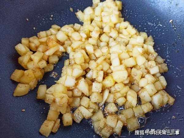 4、倒入切好的山药丁,加入一勺白芝麻,翻炒均匀,等糖浆均匀的裹住山药,馅料就做好了。