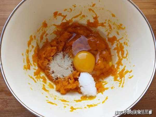 4、南瓜也蒸好了,取出倒入一个空碗中,用勺子压成南瓜泥,然后加入2克酵母粉,打入1个鸡蛋,半勺白糖,南瓜自带糖分甜味,不吃甜可不加,继续搅匀溶解。