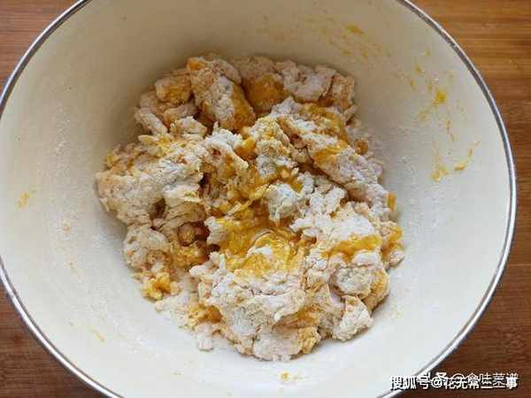5、分次加入普通面粉,边倒边搅拌,无需添加一滴水,搅成面絮的样子,淋入适量食用油,增加面团的光滑度,下手揉成光滑的面团。