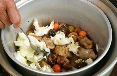 Step3:将白菜切块,可切大块一些增加口感,再连同步骤1、2的食材和猴头菇、青豆依序倒入内锅中。Tips:干燥的猴头菇因为处理的工序较为繁复,建议使用市售的罐装猴头菇,只需开罐即可使用,在家烹饪时较为便利。