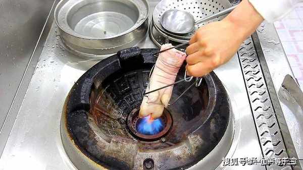 1.首先,我们处理一下猪蹄,开小火,先把猪蹄在火上烤去猪毛,破坏猪肉的汗腺,然后把烤过的猪蹄放在清水中清洗干净。