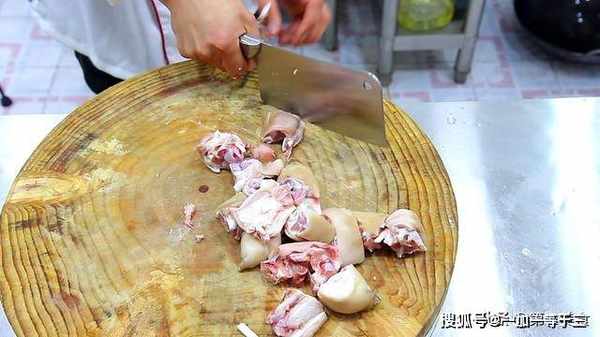 2.用刀把猪蹄从中间劈开,然后切成小块,放在盆里备用。