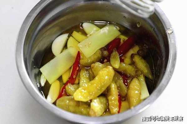 2、大蒜几粒切成片;生姜一块也切成片;小米椒几个,从中间破开放在一起,再倒入一把野山椒和100克腌制野山椒的原汁。