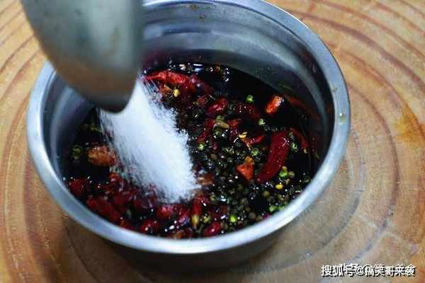 4、准备一个干净无水的盆子,加入青花椒一小把、干辣椒一小把、生抽40克、陈醋40克、食盐10克、白糖40克搅拌均匀,