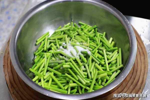 2、全部晾干以后,切成3厘米长的小段放入盆中,多倒一些食盐颠盆拌匀腌制30分钟,给蒜苔出一下水,