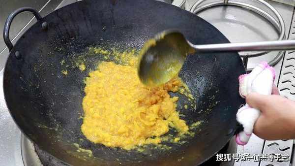 3.这个时候,火候不要太大,当白色变成焦糖色以后。把红薯泥倒入锅内,快速翻炒,中间可以适当的加点植物油,防止粘锅。