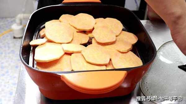 1.红心红薯一个,削去外皮,清洗干净后切成片,不要切的太厚,然后放到蒸锅内,蒸30分钟,薄一点容易蒸熟。