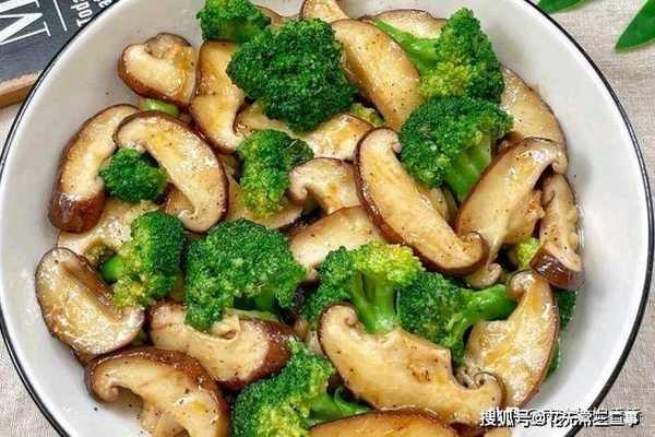 3、起锅烧油,油热放入蒜末翻炒爆香,下入香菇片翻炒至软,再放入西兰花翻炒均匀。加入1勺蚝油、半勺食盐、少许胡椒粉,翻炒均匀即可出锅。