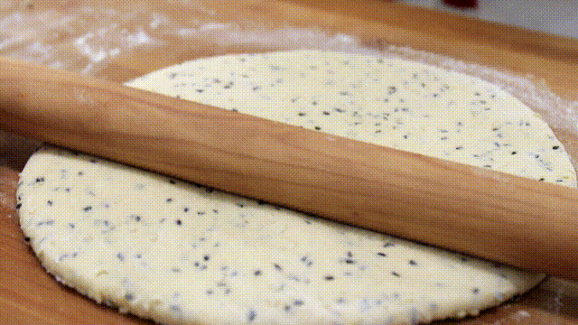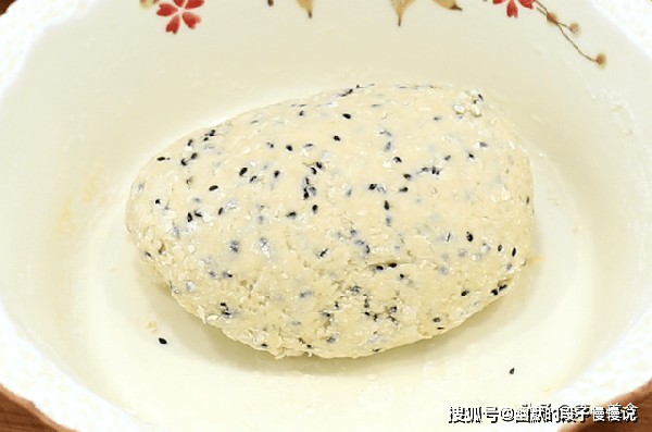 撒上一些白芝麻和黑芝麻,用手搅成面絮,再揉成面团这个面要和得硬一些,所以水量需要自己感觉把控,把面团揉光滑以后,盖上保鲜膜饧面半个小时。