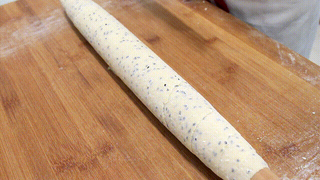 然后在面片上面均匀地撒上面粉,再把面片缠绕在擀面杖上,用力向两边反复按压面片。